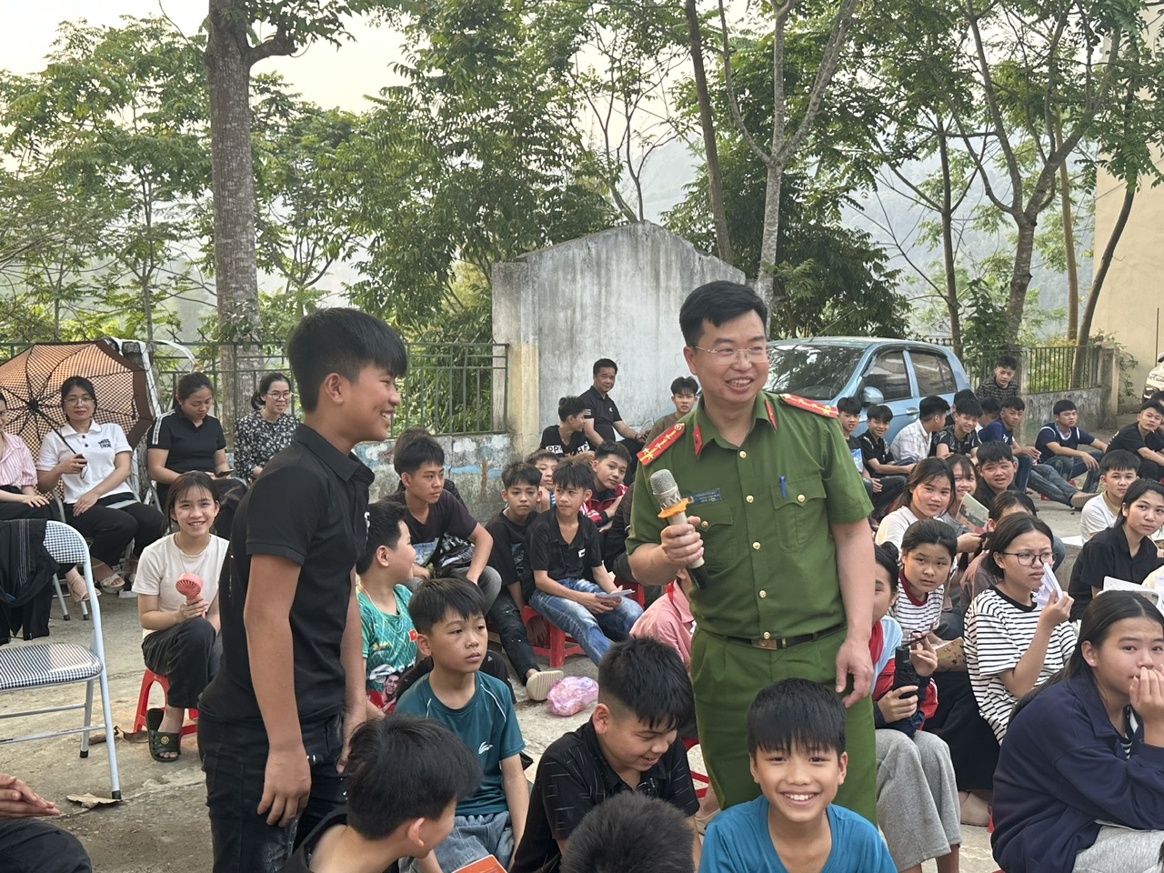 Đồng chí Hoàng Đức Đạt – Phó Trưởng Công an xã đặt câu hỏi, giải đáp thắc mắc của học sinh