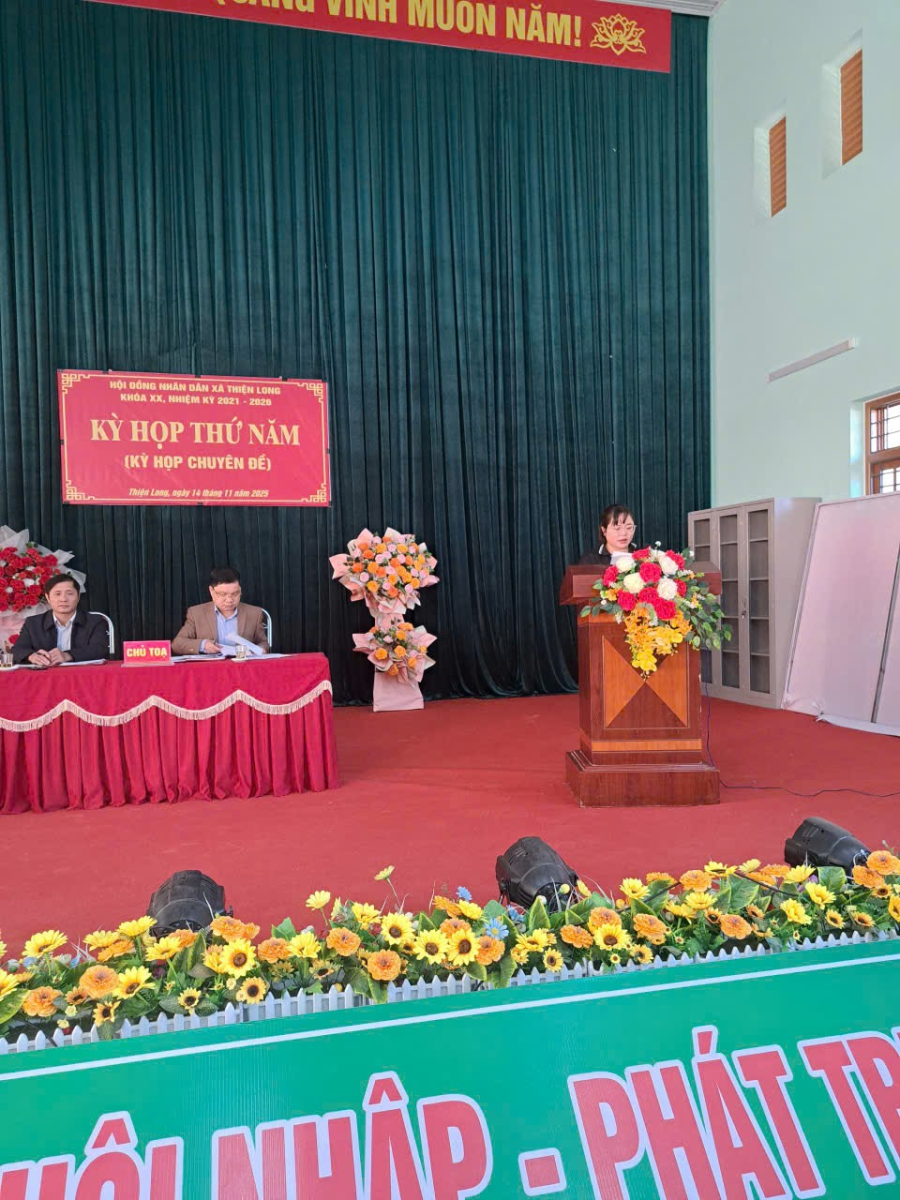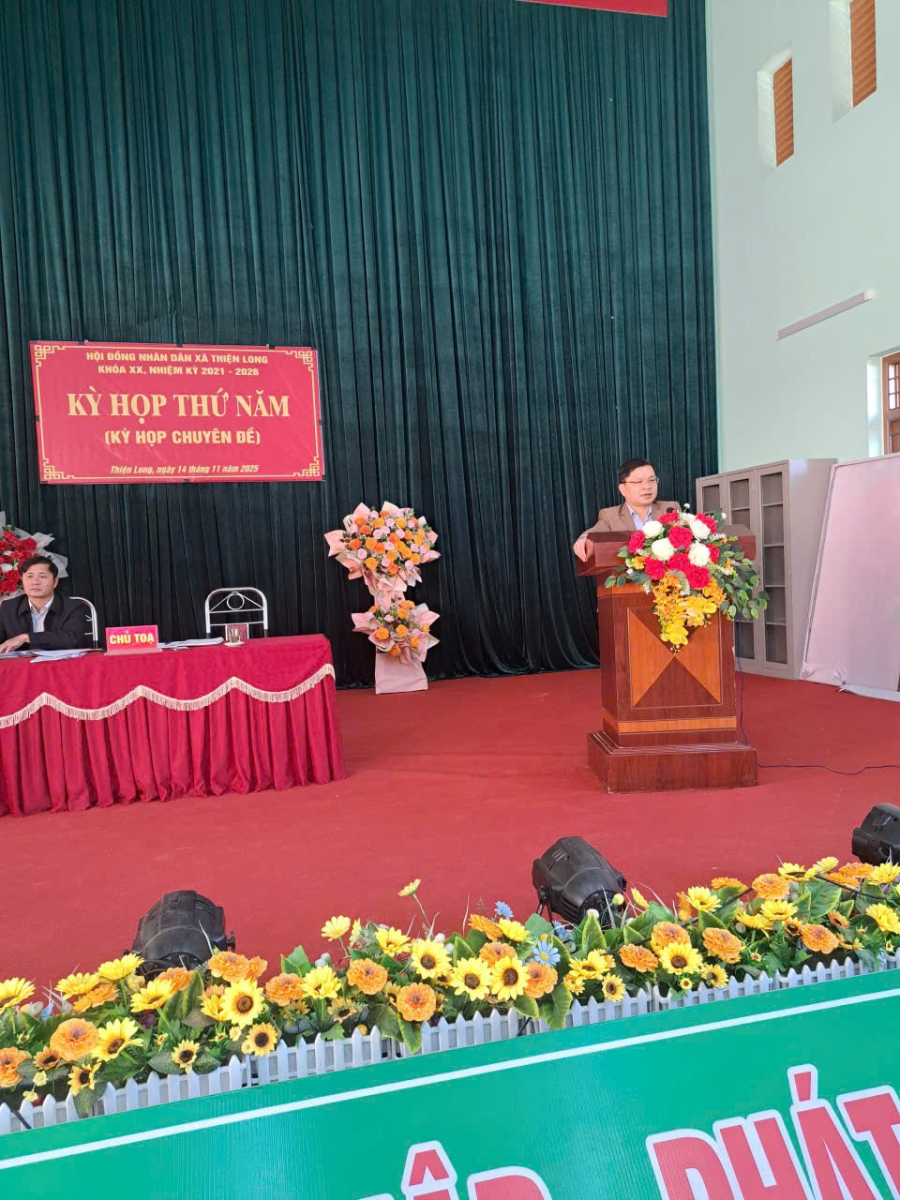 Ngày 14 tháng 11 năm 2025, Hội đồng nhân dân xã Thiện Long khóa XX đã tổ chức kỳ họp thứ năm (kỳ họp chuyên đề) nhằm xem xét, thảo luận và quyết nghị một số nội dung quan trọng thuộc thẩm quyền của HĐND xã; Tham dự kỳ họp có 40/49 đại biểu HĐND xã, đạt 81,63% tổng số đại biểu. Với tinh thần làm việc nghiêm túc, khẩn trương và trách nhiệm cao, kỳ họp thứ năm HĐND xã khóa XX, nhiệm kỳ 2021- 2026 đã diễn ra thành công tốt đẹp, với những nội dung sau: