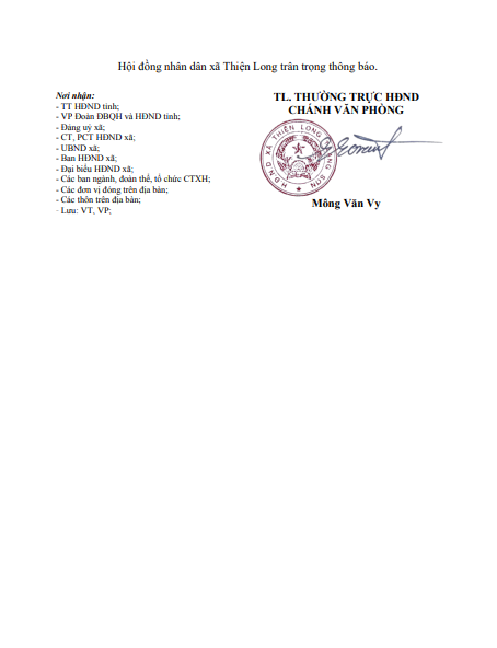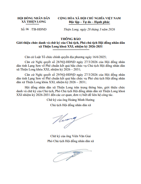 THÔNG BÁO Giới thiệu chức danh và chữ ký của Chủ tịch, Phó chủ tịch Hội đồng nhân dân xã Thiện Long khoá XXI, nhiệm kỳ 2026-2031