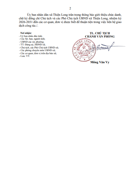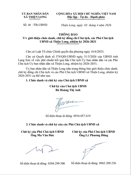 THÔNG BÁO V/v giới thiệu chức danh, chữ ký đồng chí Chủ tị ch, cá c Phó Chủ tịch UBND xã Thiện Long, nhiệm kỳ 2026-2031