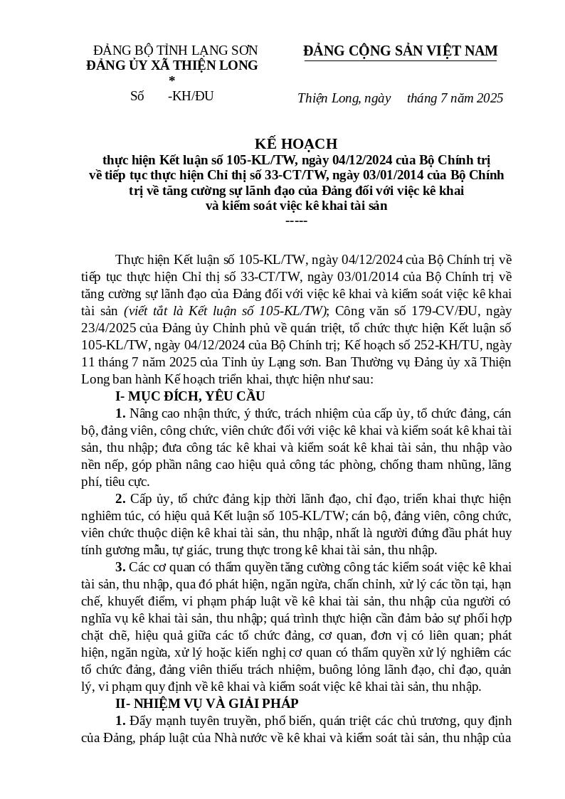 | Tiêu đề văn bản | KẾ HOẠCH Triển khai thực hiện các nhiệm vụ trọng tâm năm 2025 | ||