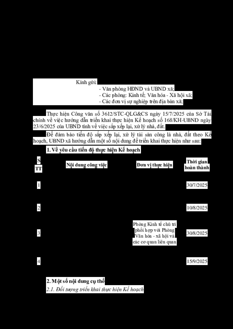 | Tiêu đề văn bản | V/v hướng dẫn triển khai thực hiện Kế hoạch số 168/KHUBND ngày 23/6/2025 của UBND tỉnh về việc sắp xếp lại, xử lý nhà, đất | ||